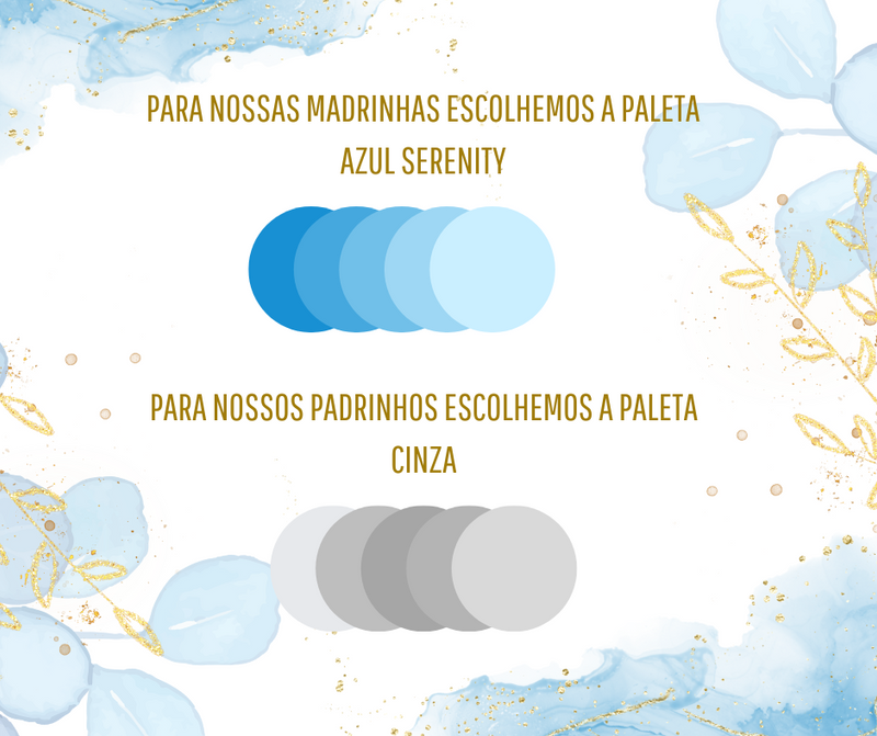 Tons próximos: azul serenity é um azul pastel bem suave. Certifique-se de que o cinza do terno dos padrinhos seja suave também, para não criar contraste muito forte.